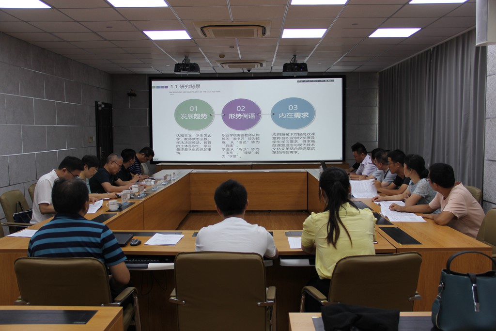 此次开题的有:苏辉老师主持的课题《微学习在中职高效课堂构建中的应用研究》,鞠兴祥老师主持的课题《中职机器人辅教助学研究》。两位课题主持人从课题的选题背景、研究目标、基本内容、研究方法、研究步骤、预期成果和研究分工等方面向与会专家作了全面汇报。《微学习在中职高效课堂构建中的应用研究》从中职学生学情出发,借鉴精英中学高效“6+1”课堂模式,将前两步 “导”“思”合为“微学习”,采用视频学习与练习作为“导”,并做好课前准备“思”,为课堂教学“议、展、评、检”服务,充分在课堂上展示学习成果,构建“实验型、应用型、开放式、协作式”高效课堂;《中职机器人辅教助学研究》通过自主研发机器人辅助教育平台及辅教助学实践,为中职专业课程教学拓展提供新的开发途径和教学借鉴,促进学生学习方式、学习态度、学习能力等的改变,提高学生学习质量。
